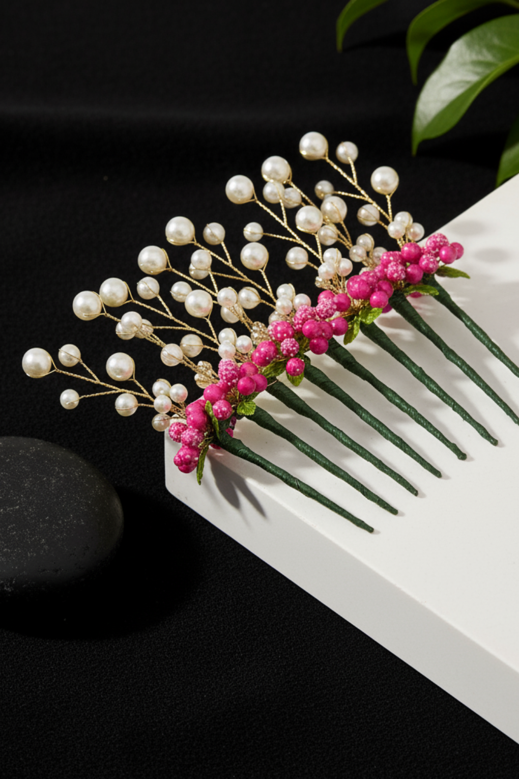 The AccessoZone Dark Pink Pearl Floral Hair Pins – Pack of 8 are beautifully handcrafted to give your hairstyle a bold, elegant, and vibrant finish. Each pin features rich dark pink floral accents combined with glossy white pearls, creating a striking and feminine look. These lightweight pins slide in easily, stay secure for hours, and feel comfortable throughout any event. Perfect for bridal buns, curls, braids, and festive hairstyles, they instantly elevate your appearance with a premium, photogenic charm. Ideal for weddings, engagements, sangeet, parties, haldi-mehendi events, and photoshoots, this set of 8 stylish pins is perfect for women who love trendy and colorful hair fashion.