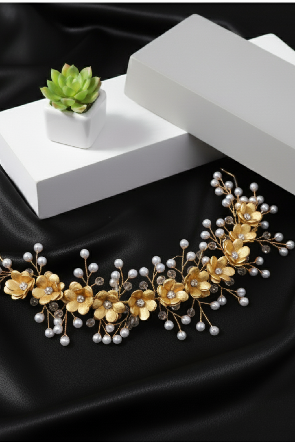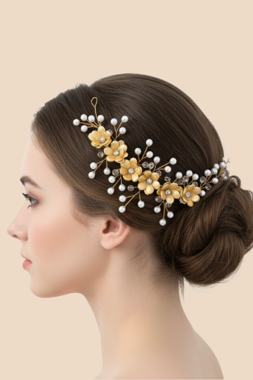 Handcrafted golden floral & pearl hair vine for bridal, party & festive hairstyles. Lightweight, elegant and flexible for all updos.