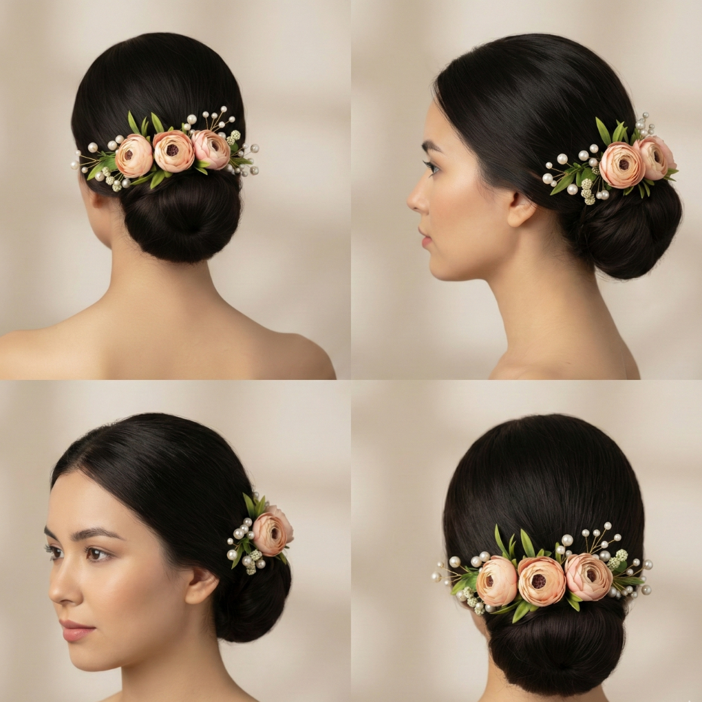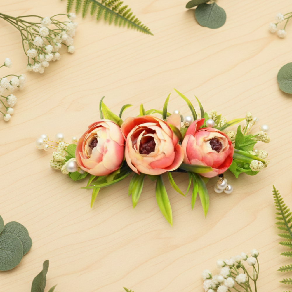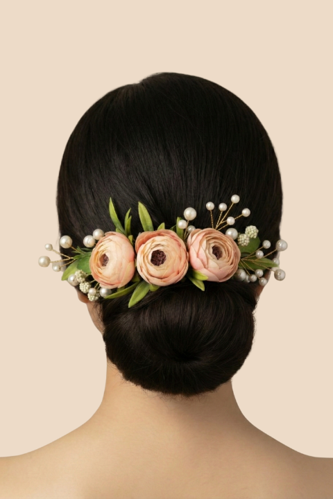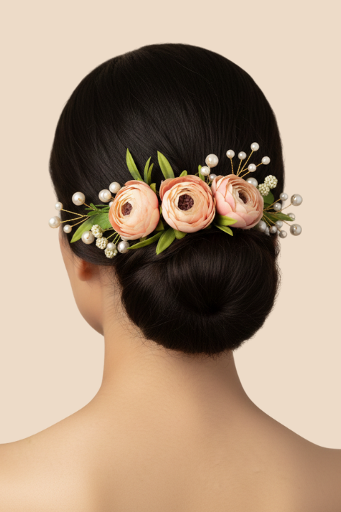 Featuring beautifully crafted peach flowers, lush green leaves, and premium pearl embellishments, this hair comb adds an instant touch of sophistication to any bridal bun—classic bun, low bun, messy bun, or textured juda.