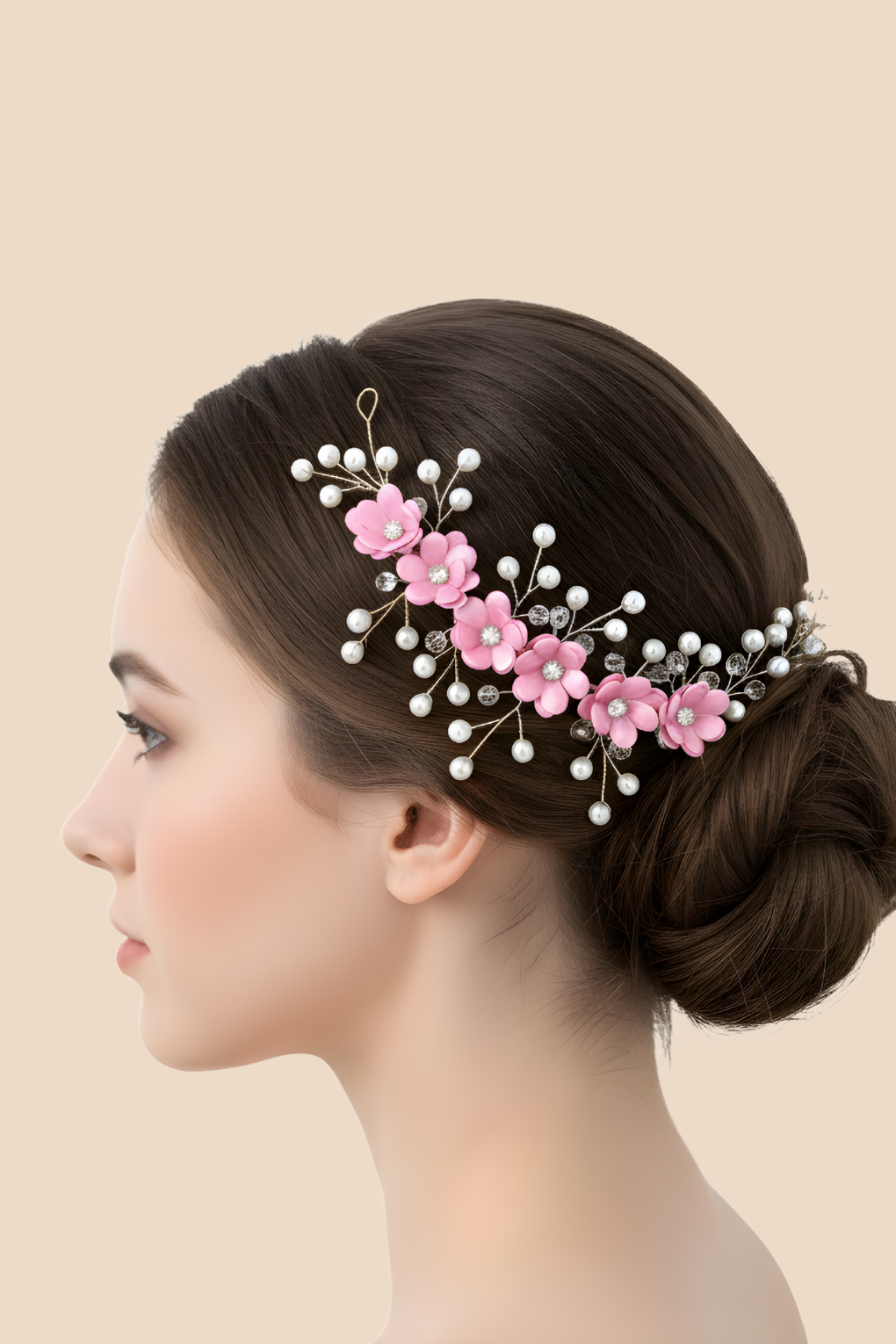 Handcrafted pink-light floral & pearl hair vine for bridal, party & festive hairstyles. Lightweight, elegant and flexible for all updos.