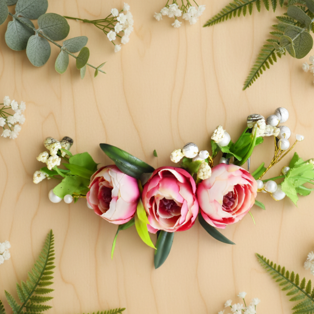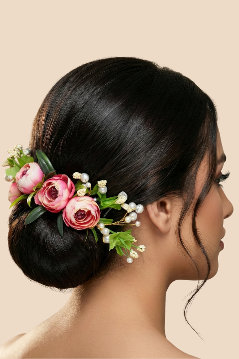 Crafted with realistic pink peony flowers, lush green leaves, and delicate pearl accents, this accessory gives a fresh, natural, and premium look. Perfect for brides who want a floral touch without using heavy or real flowers that wilt quickly.