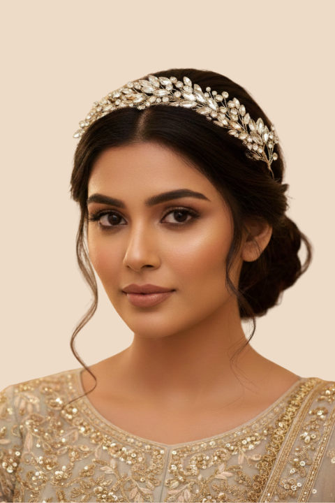 Handcrafted golden crystal bridal hairband with pearl shine detailing. Lightweight, elegant & perfect for weddings and festive occasions.