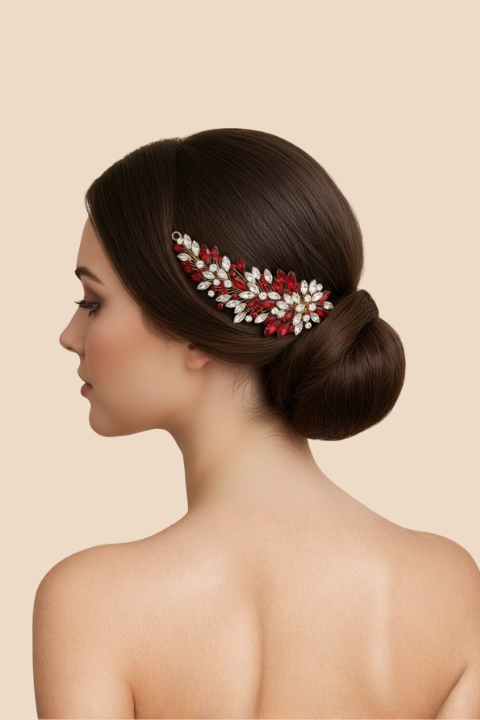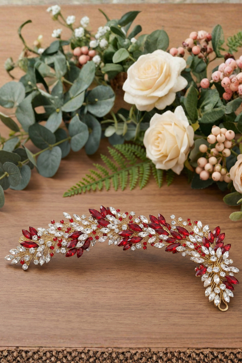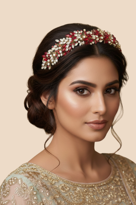 This premium headpiece features ruby-red stones, gold accents, and pearl detailing arranged in a delicate floral-leaf pattern. Made with high-quality materials, it sits comfortably on all hairstyles—buns, open hair, waves, braids—without slipping.
