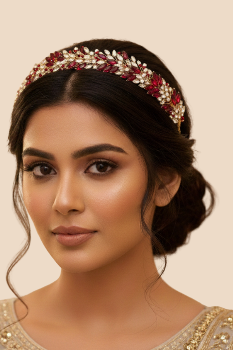 Handcrafted red & gold crystal bridal hairband with premium pearl detailing. Perfect for weddings, receptions & festive events.