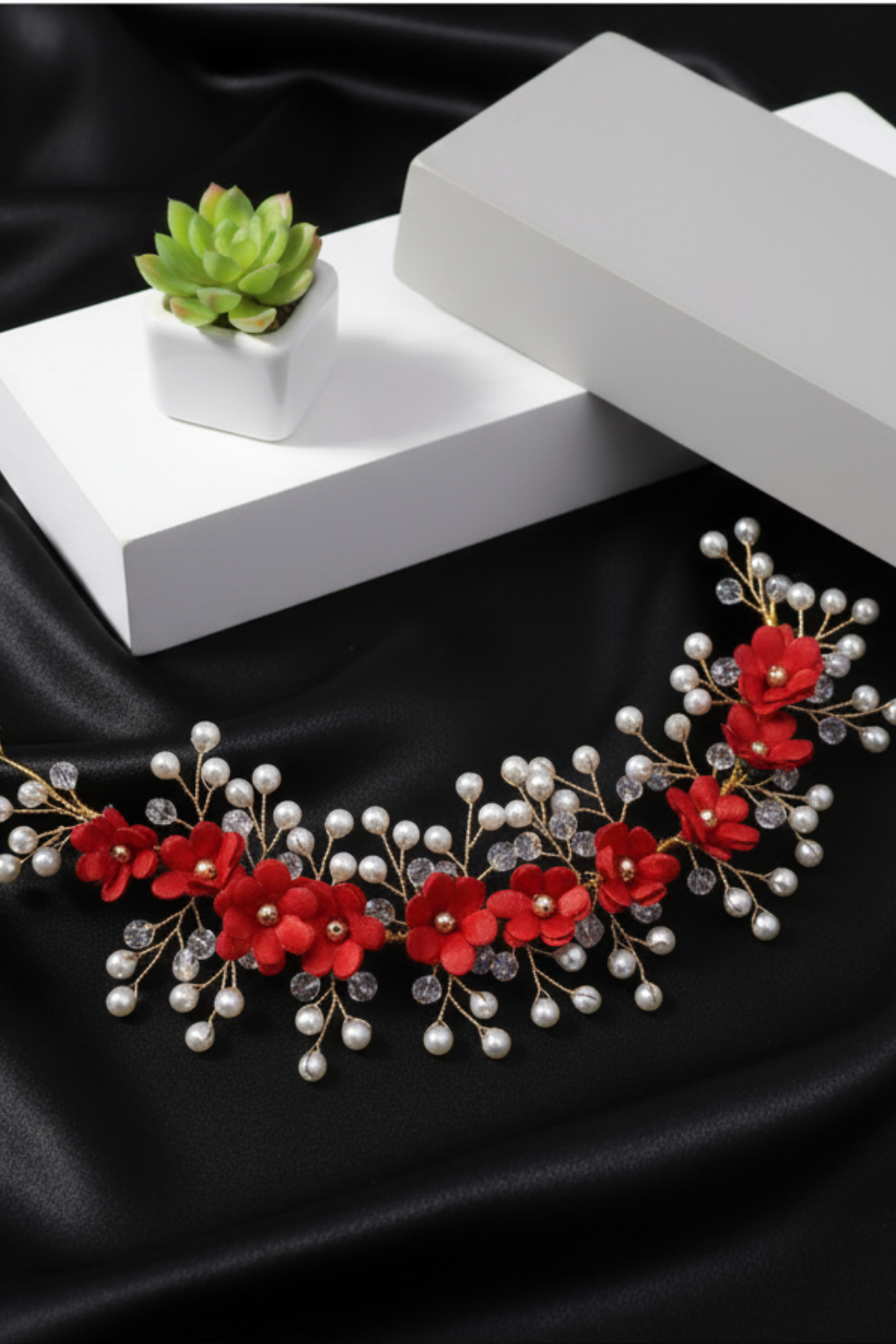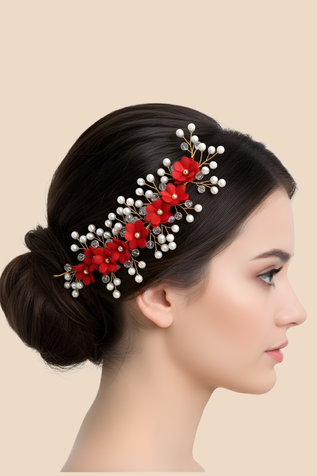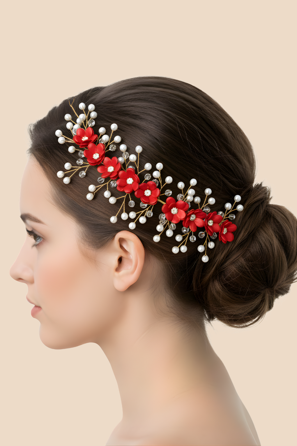 Handcrafted red floral & pearl hair vine for bridal, festive & party hairstyles. Lightweight, elegant and flexible for all updos.
