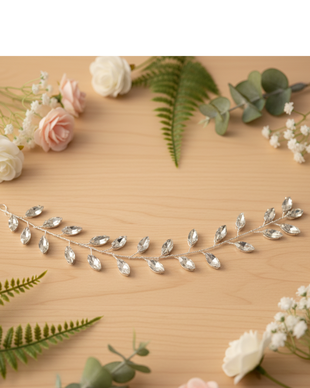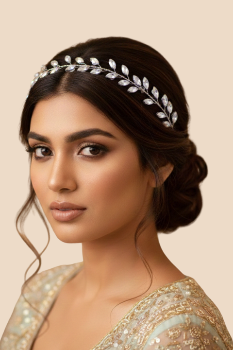 Crafted with a sleek silver metal base and adorned with premium red crystals, this hairband features a minimal vine-inspired design that suits both bridal and non-bridal styling. The contrast of silver and ruby-red crystals enhances the accessory’s premium appearance while keeping it lightweight and comfortable for long events.