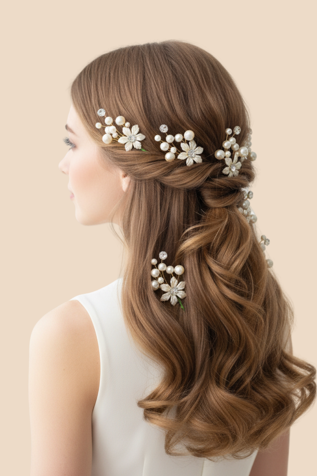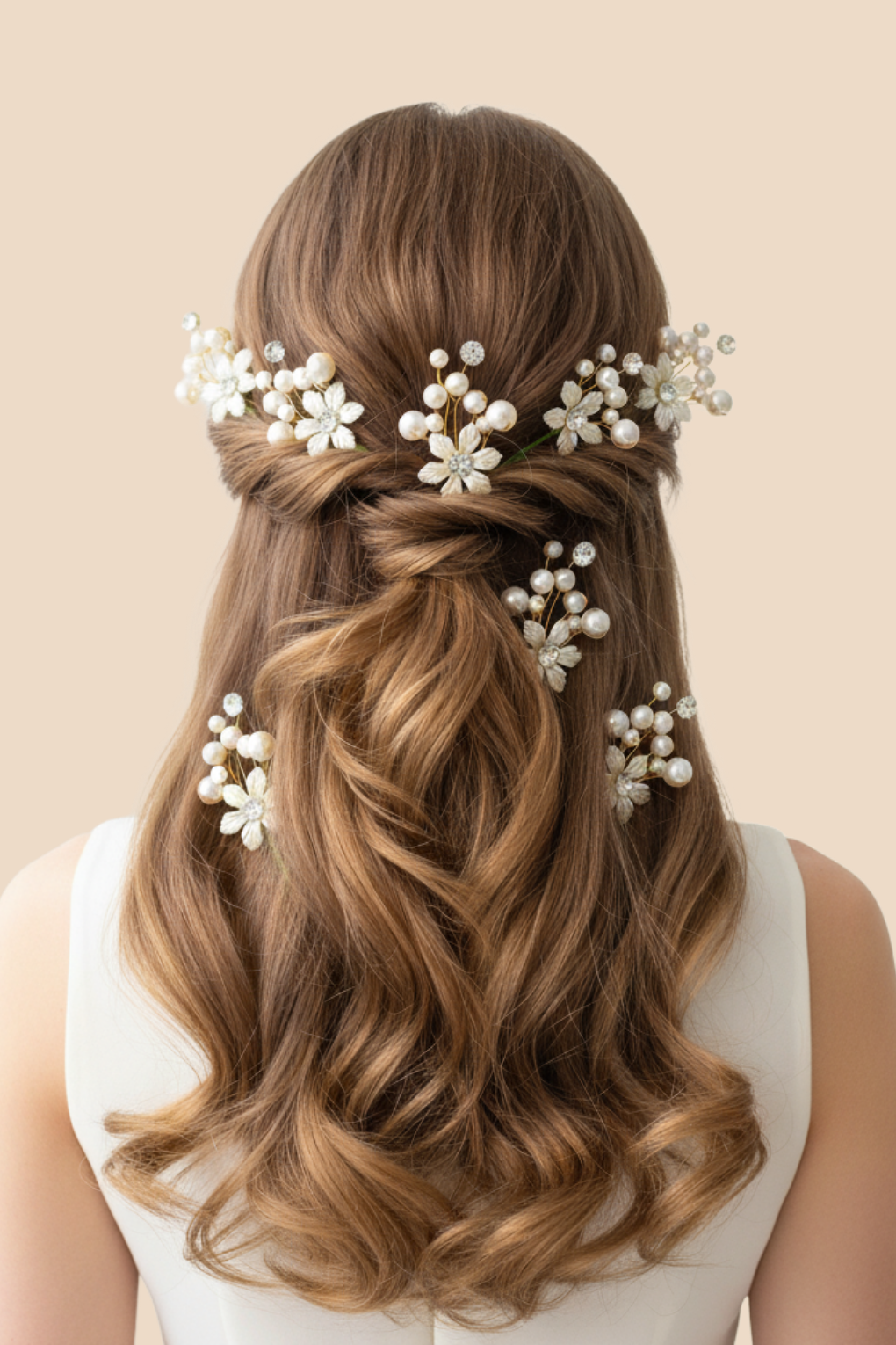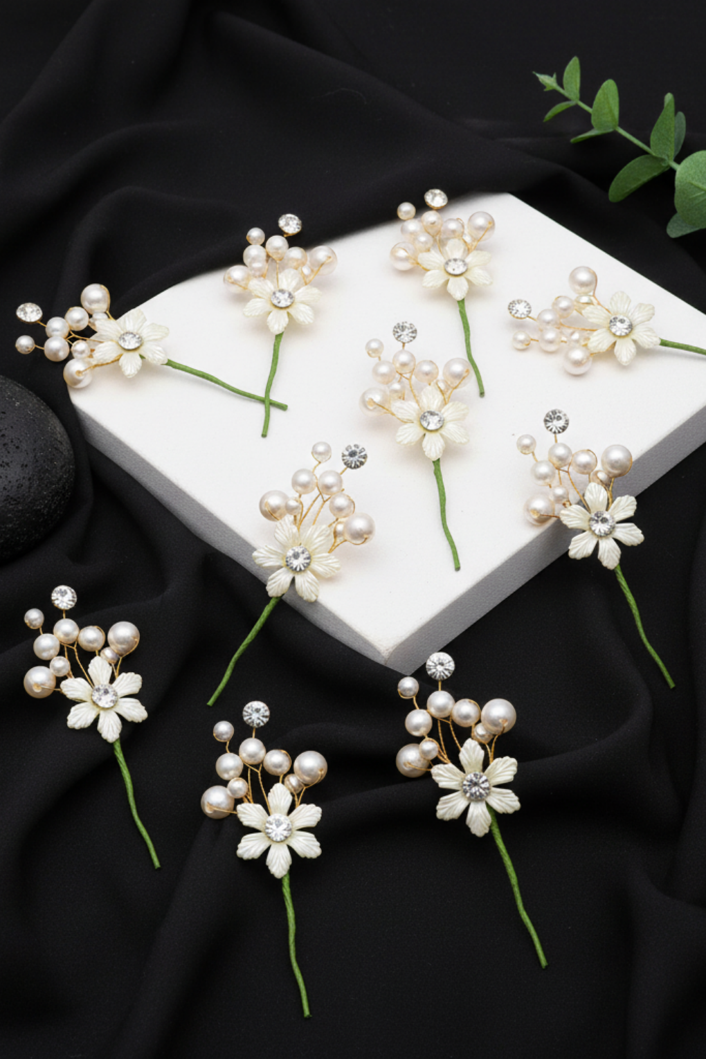 Elegant white flower, pearl & stone designer hair pins perfect for bridal, festive, and party hairstyles. Pack of 10.