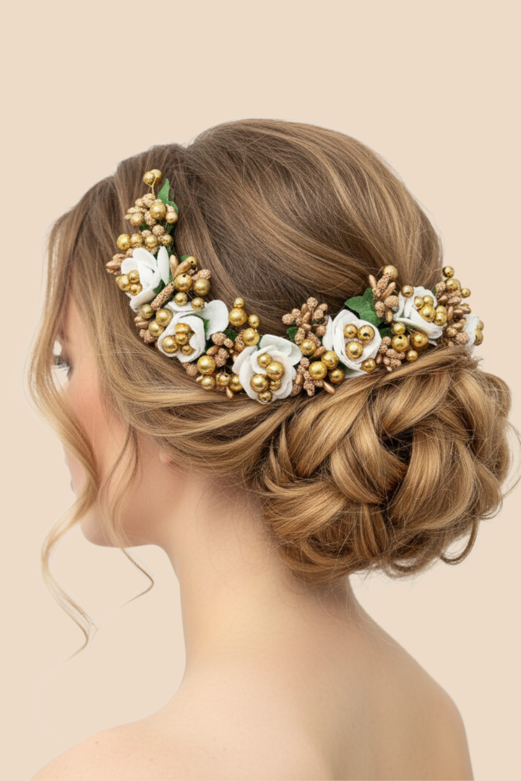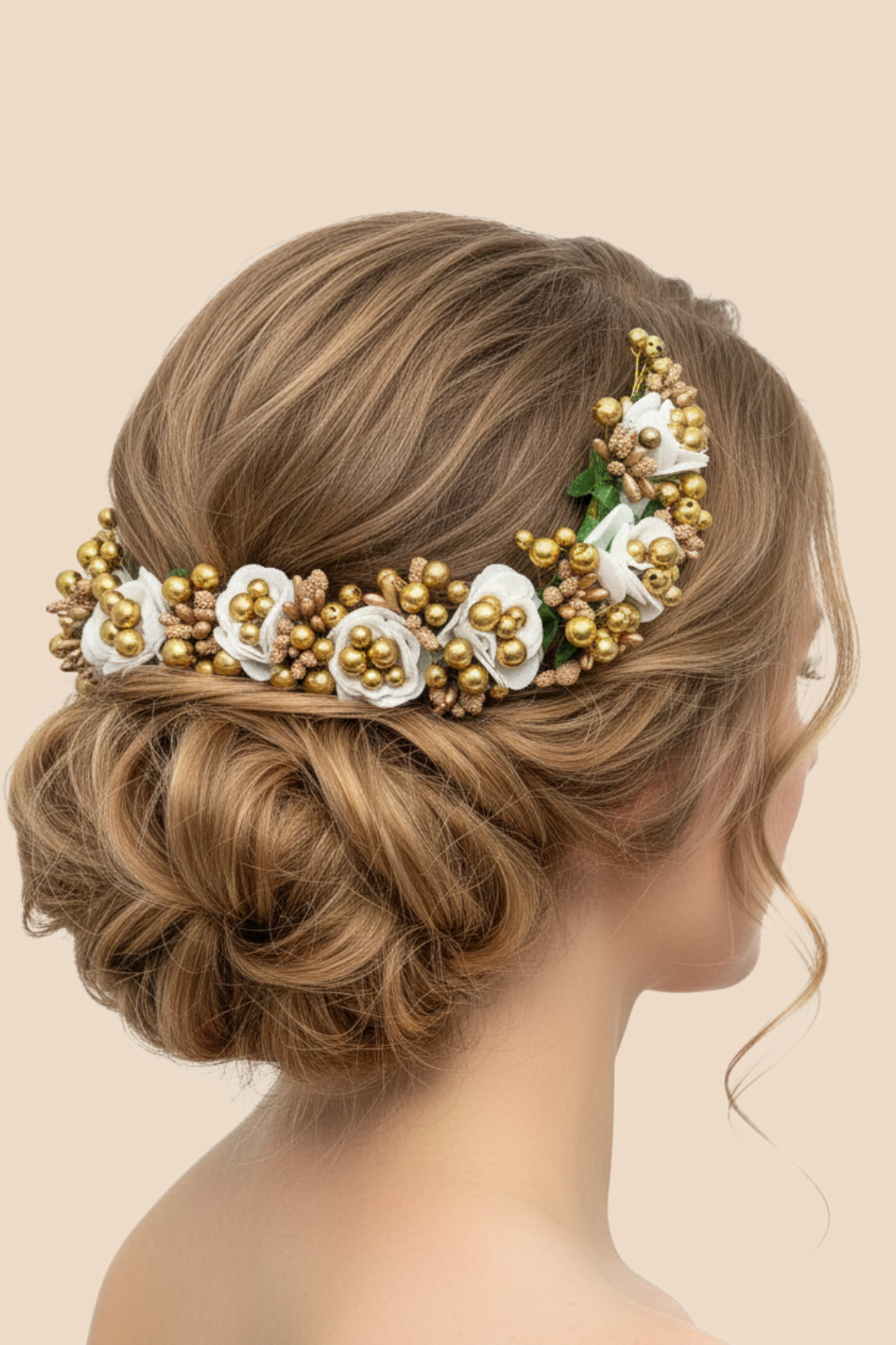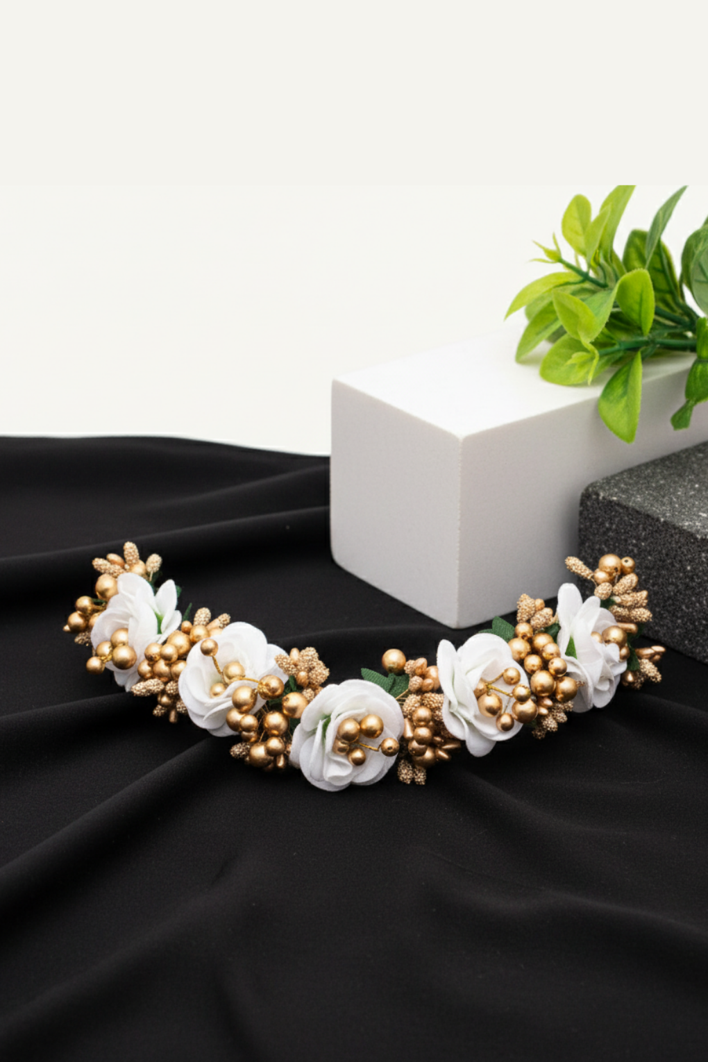 Beautiful white rose & golden pearl artificial gajra, perfect for bridal buns, juda styling, festive and elegant traditional looks.