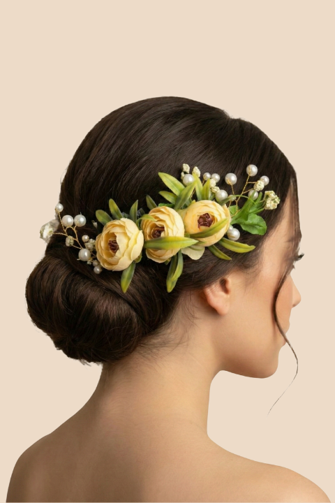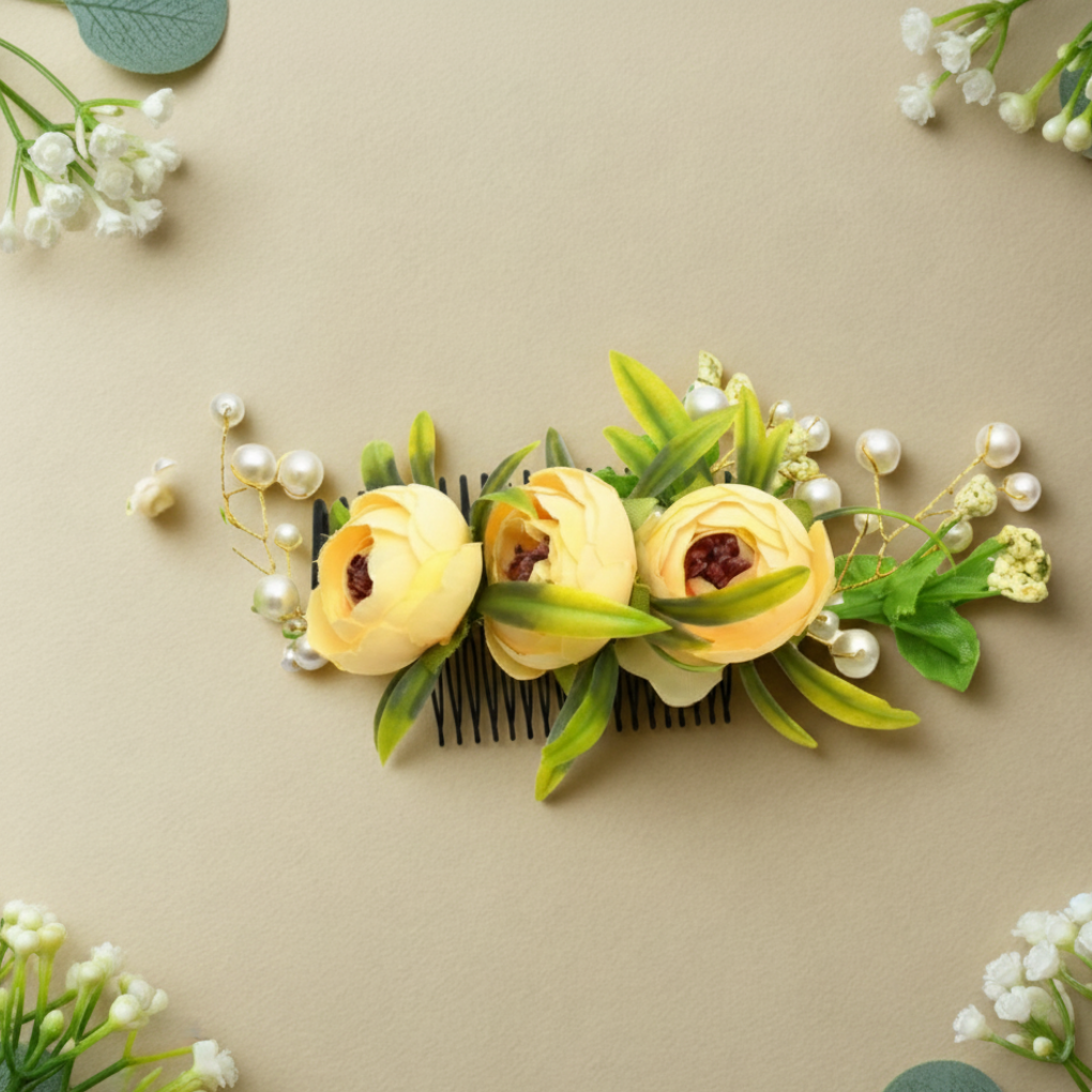 This hair comb features realistic yellow flowers, lush green leaves, and pearl accents arranged beautifully to enhance any bridal bun—classic bun, messy bun, low bun, or textured hairstyle.