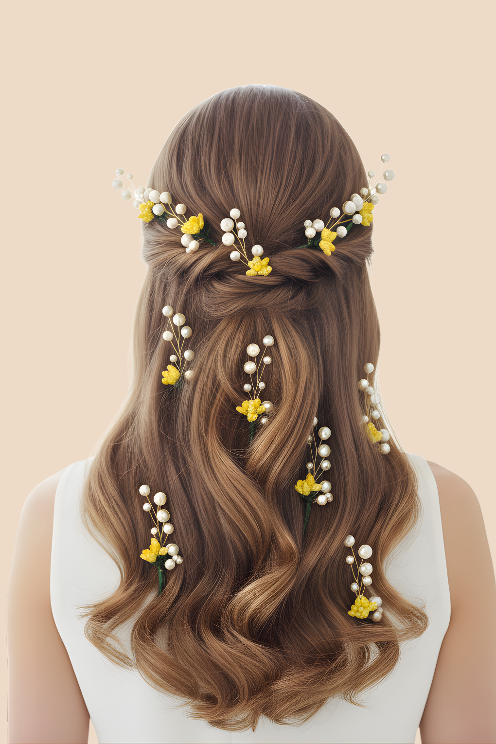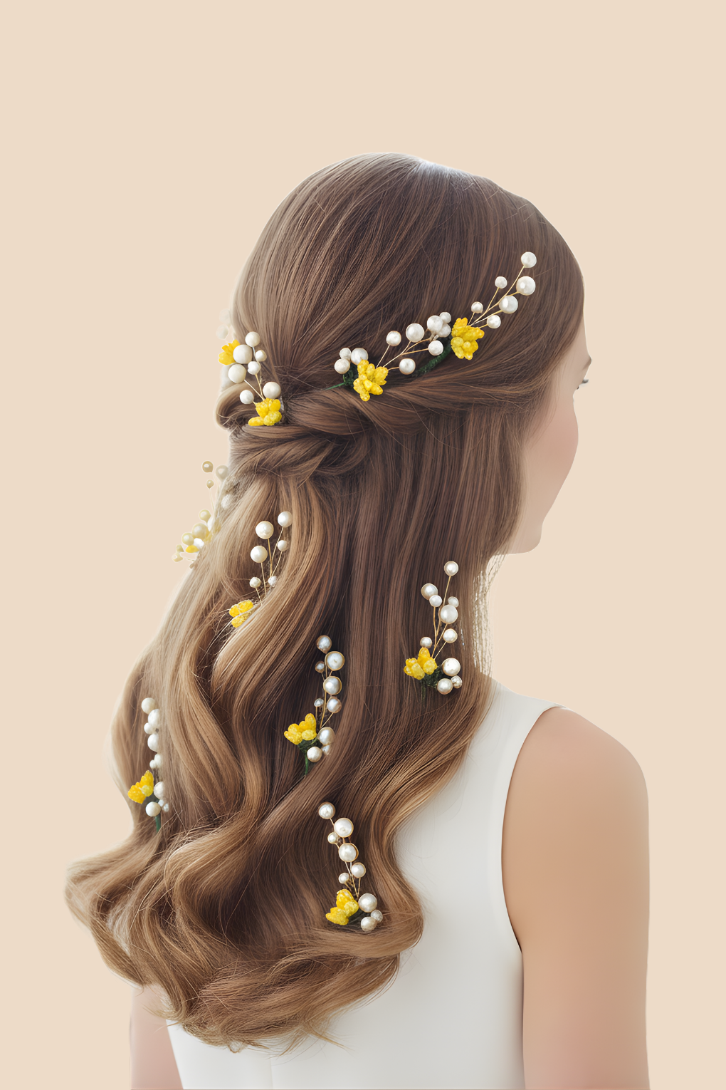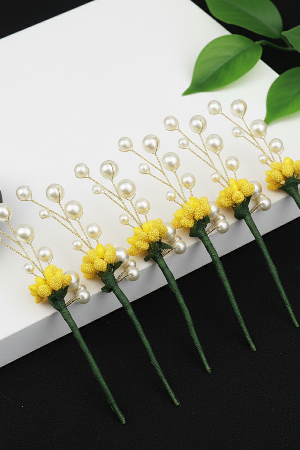 Beautiful yellow floral & white pearl decorative hair pins perfect for bridal, festive, and party hairstyles. Pack of 8.