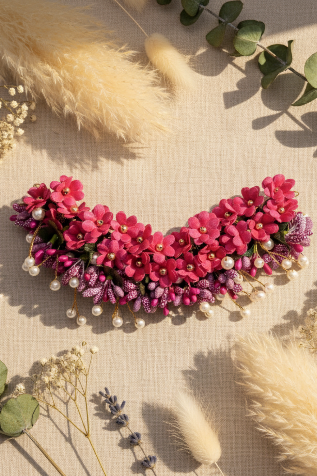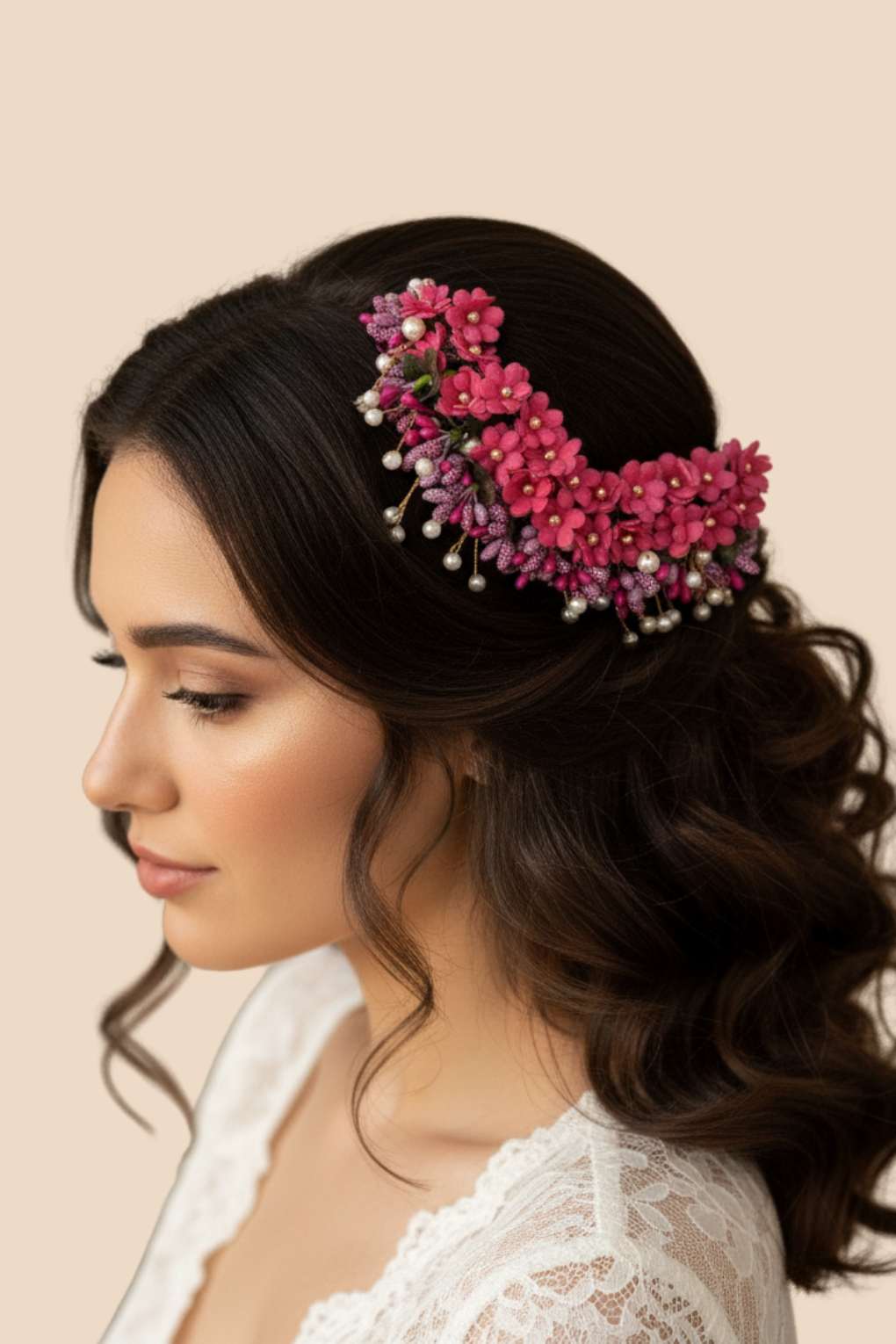 Bring a touch of bold elegance to your celebrations with the Accessozone Dark Pink Floral Bridal Headband. Designed for women who prefer vibrant and statement-making hair accessories, this handcrafted headband is adorned with deep pink flowers, premium pearls, and lush greenery, offering a stunning blend of color and sophistication.