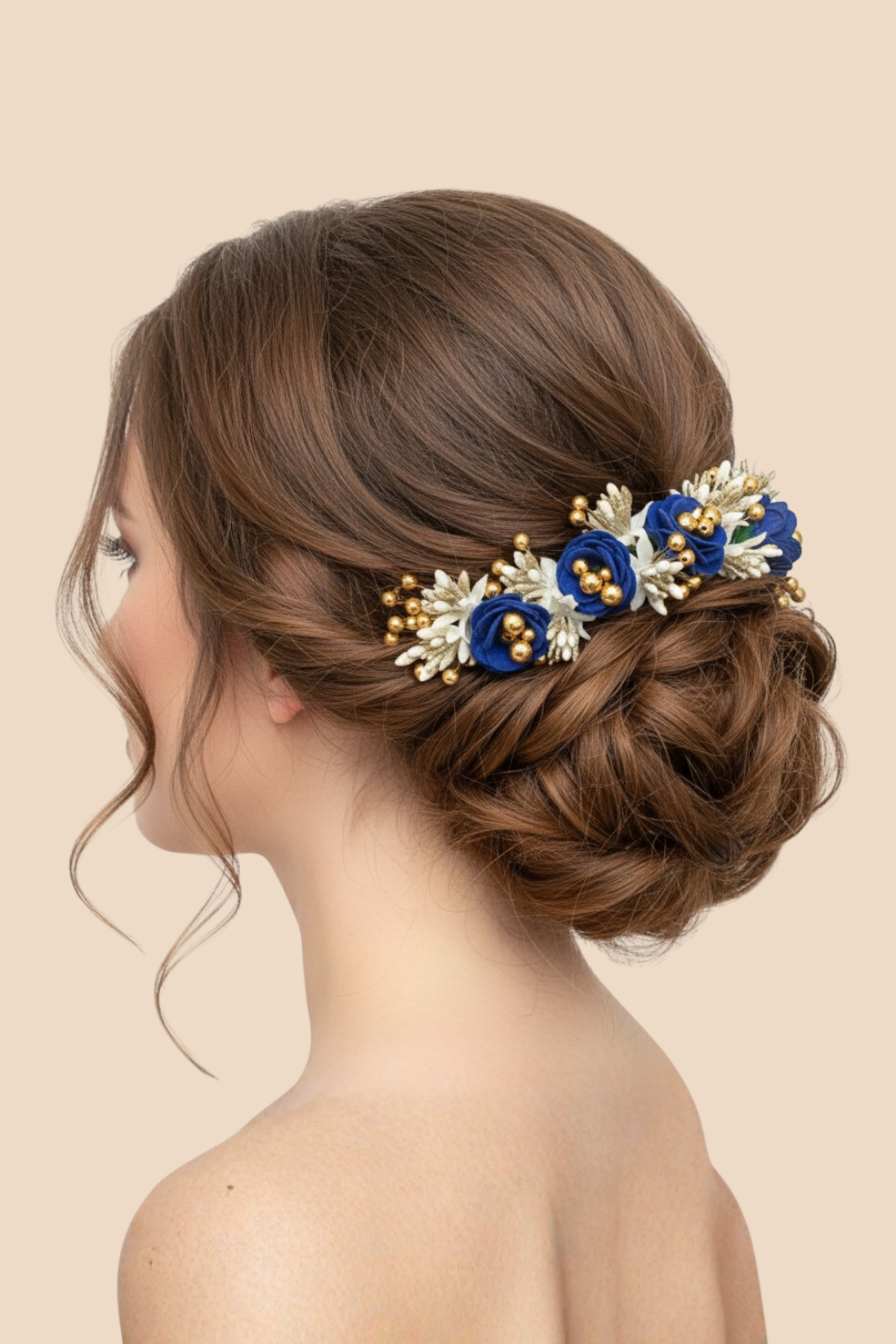 Add a luxurious touch to your bridal hairstyle with Accessozone’s Royal Blue & Gold Floral Hair Bun Accessory. Featuring handcrafted blue roses, golden beads, and delicate white accents, this premium piece elevates every bridal and festive look.
