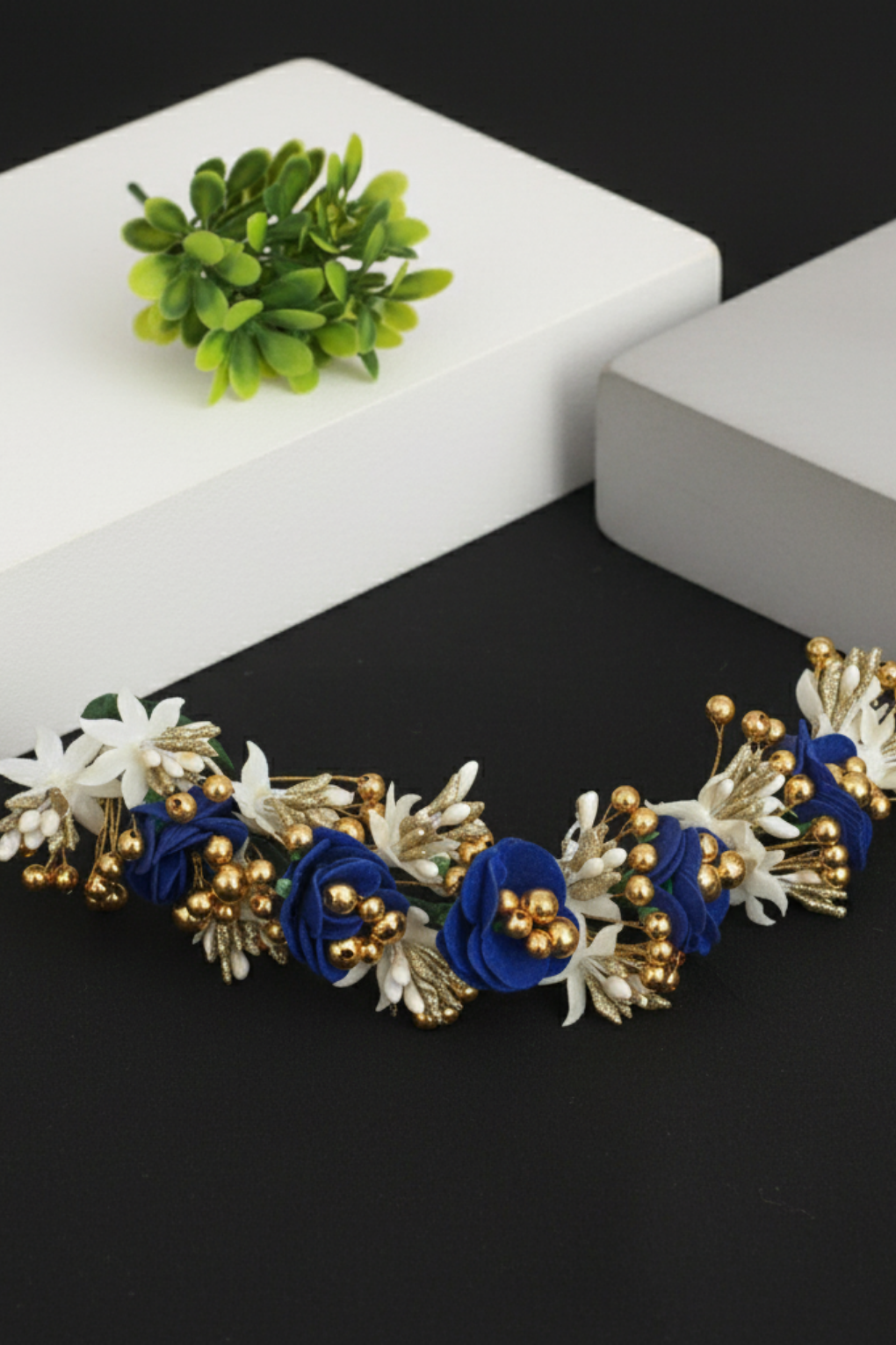 Enhance your elegance with the Accessozone Royal Blue & Gold Floral Bridal Hair Bun Accessory, designed to give brides a bold, royal, and sophisticated look. This exquisite hairpiece showcases handcrafted deep-blue roses, premium gold beads, and white floral accents, all arranged beautifully on a flexible vine base that adapts perfectly to all bun styles.
