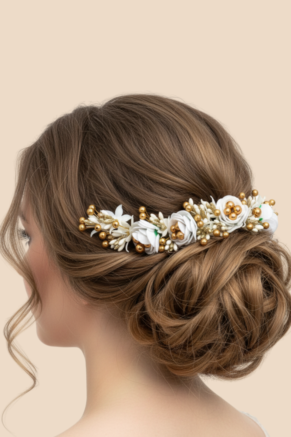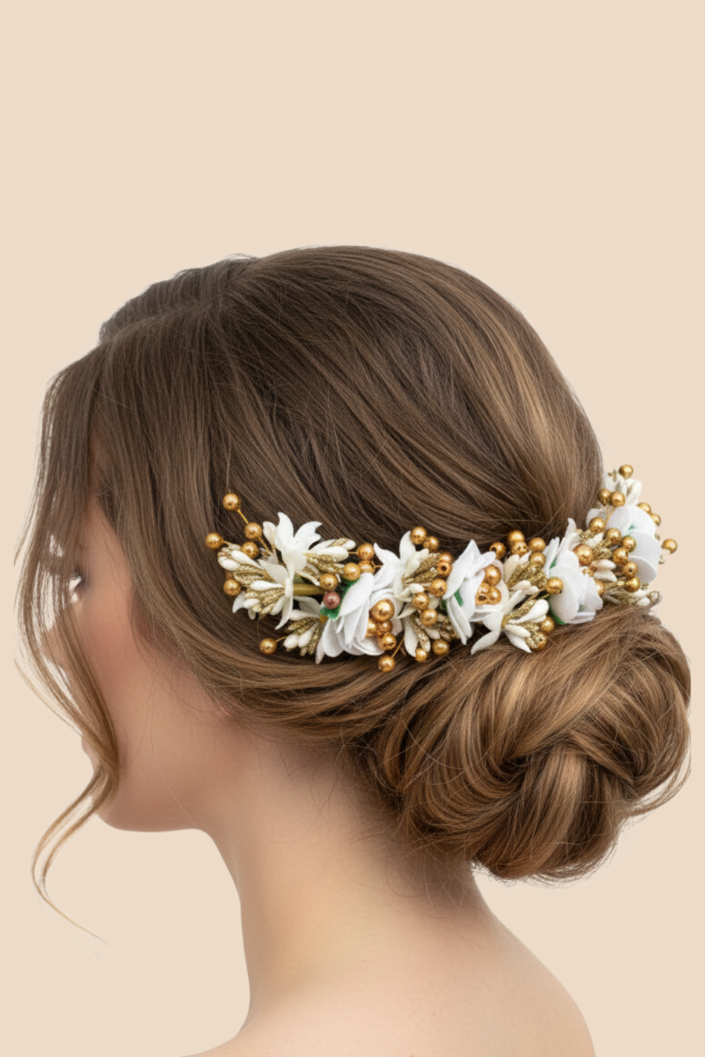 Enhance your bridal hairstyle with Accessozone’s elegant White & Gold Floral Hair Bun Accessory. Handcrafted with soft white flowers and premium golden beads, this statement piece adds a luxurious and graceful touch to any wedding or festive hairstyle.