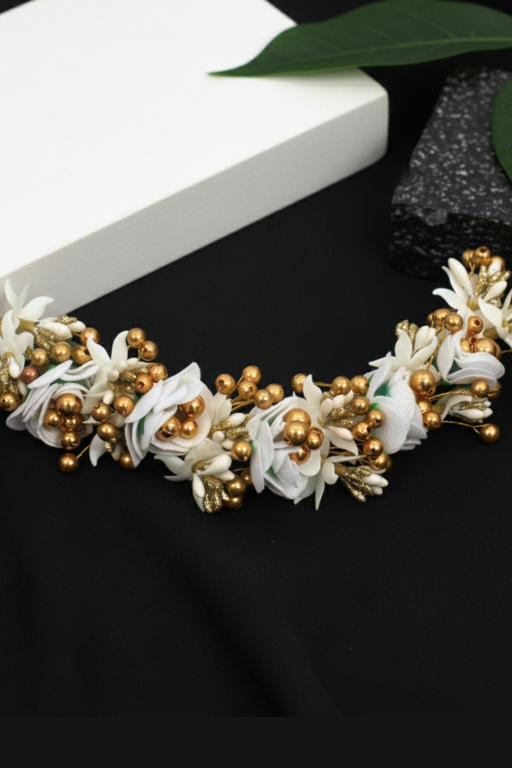 Handcrafted Beauty: Soft white florals paired with golden bead detailing.