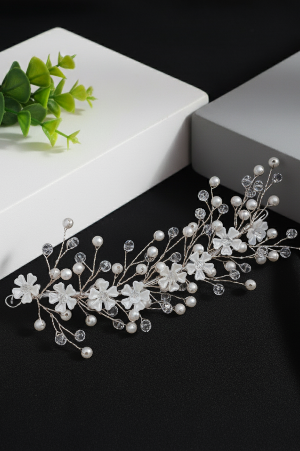 Handcrafted Detailing: White florals paired with pearls and crystal accents.